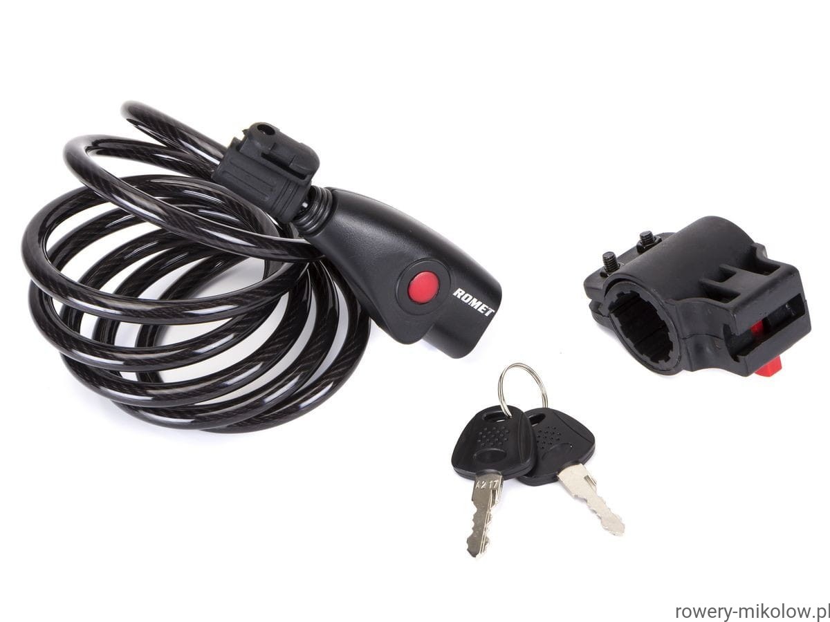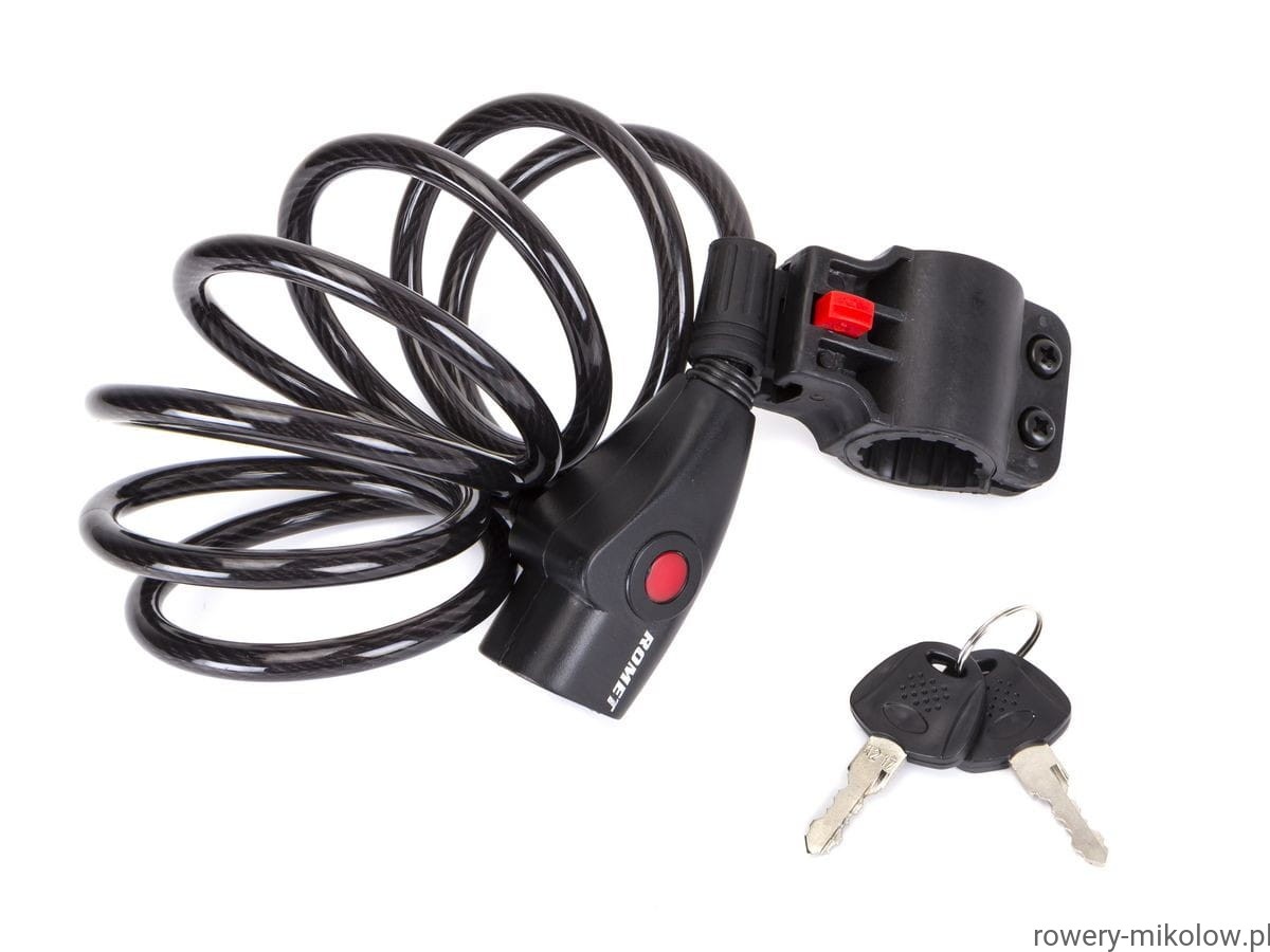 Wysokiej jakości przewód stalowy o średnicy 8mm i długości 180cm pokryty osłoną PCV w celu ochrony lakieru, zapięcie zamykane na klucz, w zsestawie uchwyt montażowy do ramy ,2 klucze